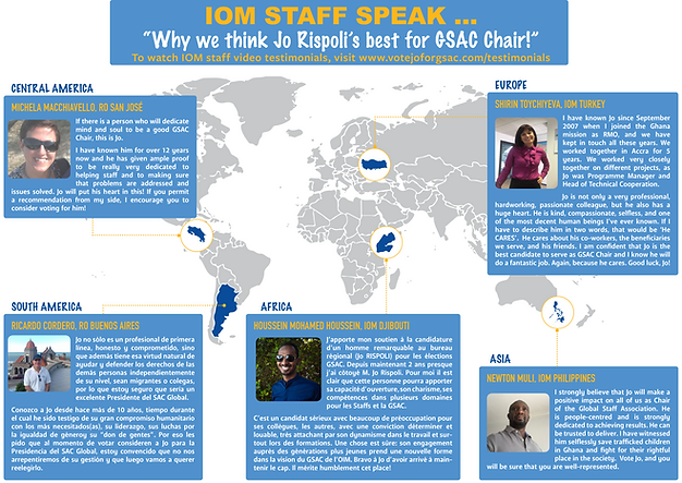 IOM staff from around the world tell us why Jo's best for GSAC Chair. Click directly on the the images to read on!